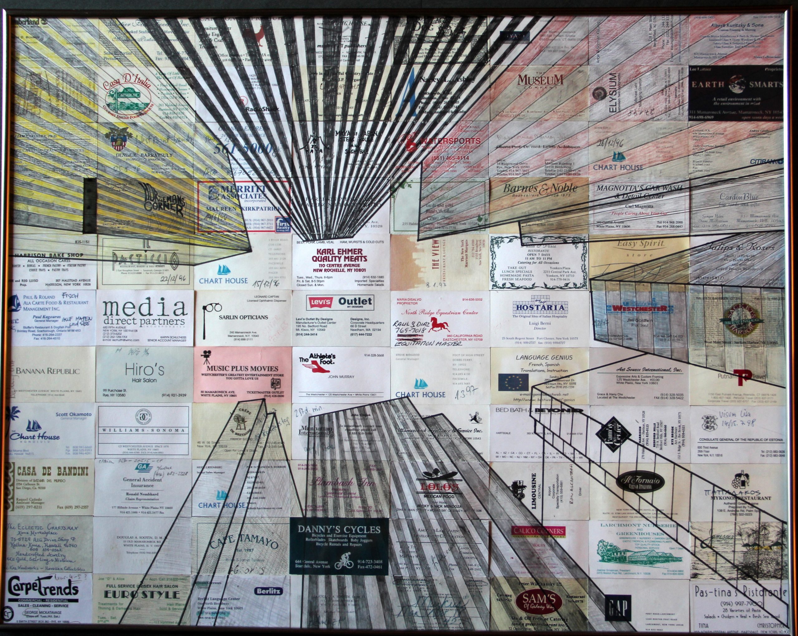 Business-Welt Werk-Nr 1998-06, Collage Collage aus Business-Cards USA,auf Unterlage geklebt, bemalt, schraffiert und gerahmtGröße (B X H) 71,5 cm x 55,5 cm Im Besitz der Künstlerin (reserviert)
