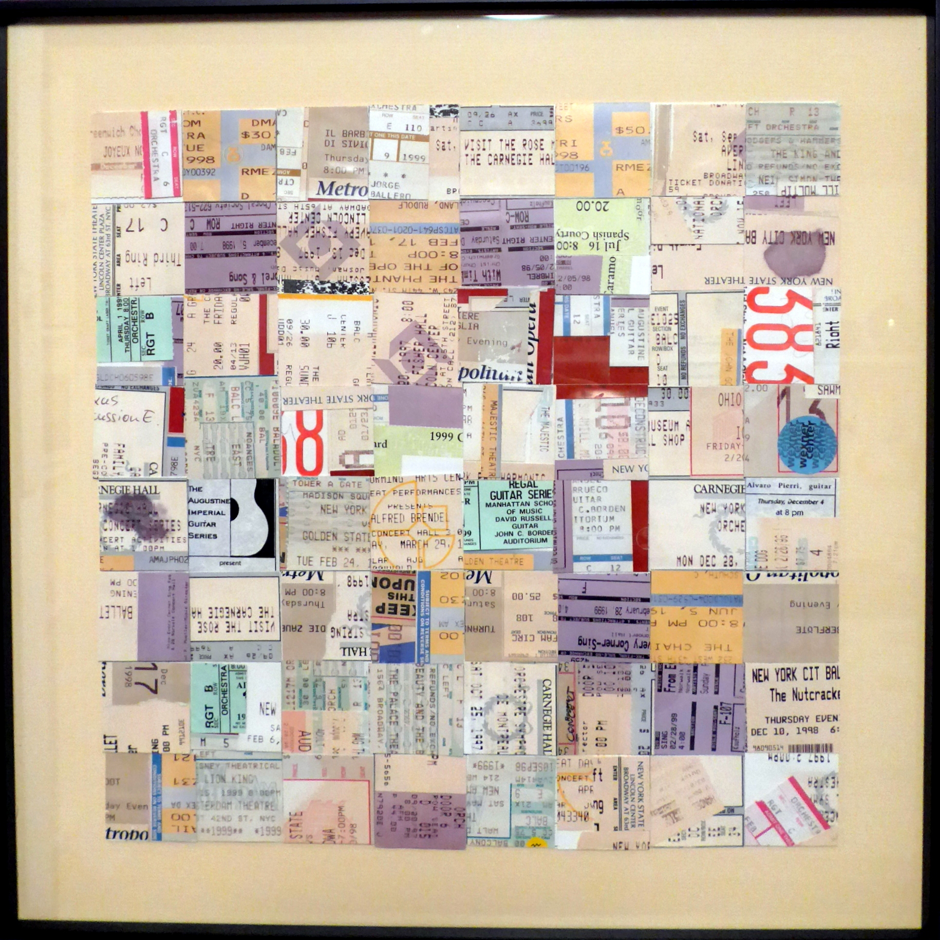 Tickets und Eintrittskarten für Theater und Konzerte, zerschnitten und rekonfiguriert (8×8 Schnipsel a 4×4 cm) auf Unterlage geklebt, gerahmt Größe (B X H) 40 cm x 40 cm