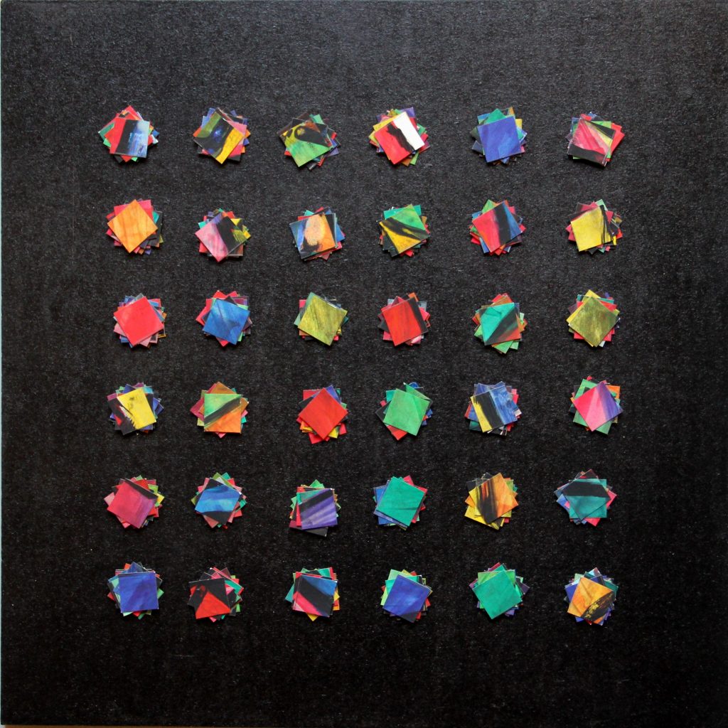 Farb-Abstraktion in Acryl, verpixelt (288 Pixel a 2×2 cm), 8-fach geschichtet und rotiert, in 6×6 Pixel-Raster angeordnet, auf schwarze Holzplatte geklebt Größe (B X H) 40 cm x 40 cm