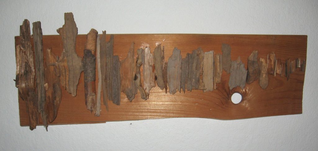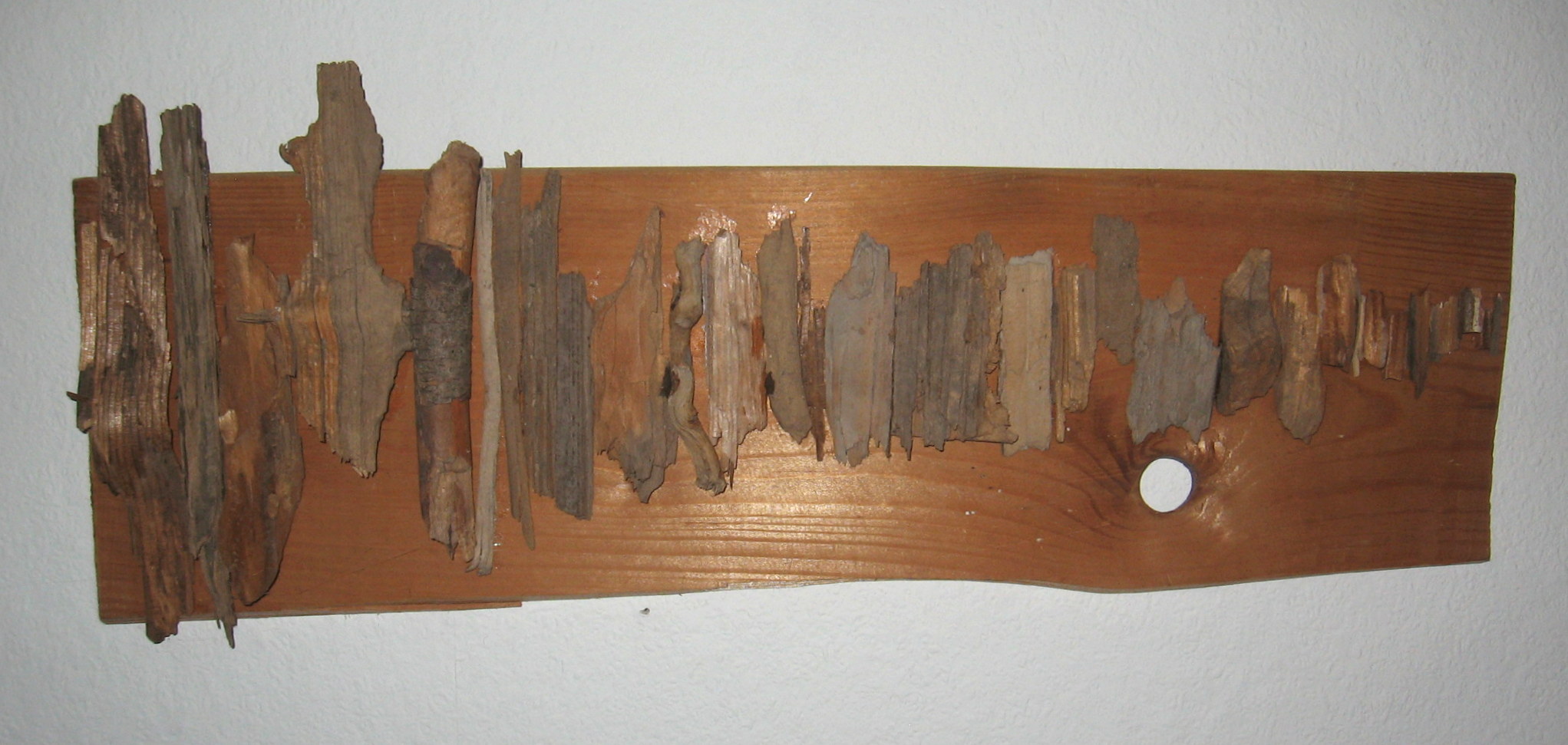 Seismogramm Werk-Nr 2010-04, Assemblage Fundstücke aus Wald-Holz,längs aneinander gereiht,auf Unterlage aus Fundholz befestigtGröße (B X H) 50 cm x 20 cm Nicht mehr im Besitz der Künstlerin