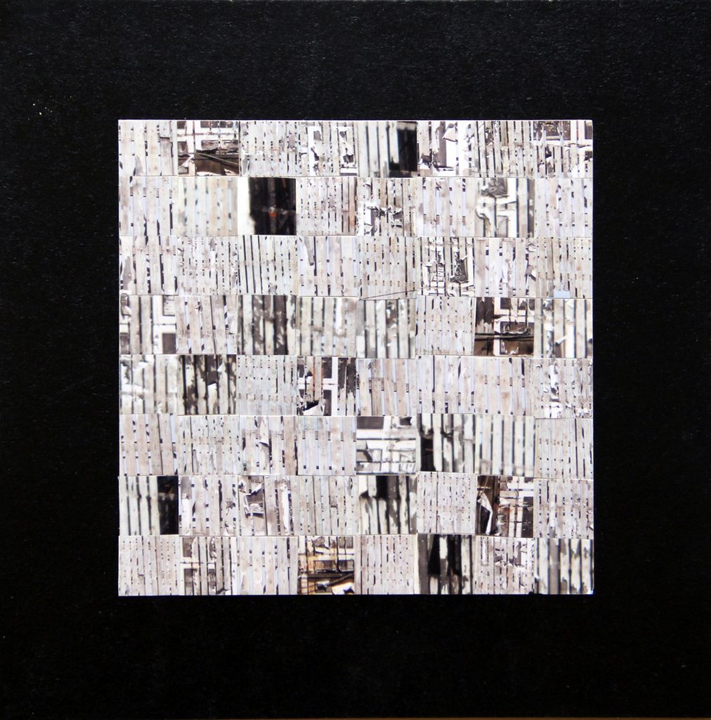 Abriss Werk-Nr 2010-15, Rekonfiguration Foto von Bretterwand,verpixelt und rekonfiguriert (8×8 Pixel a 2,5×2,5 cm),auf schwarze Holzplatte geklebt,Größe (B X H) 30 cm x 30 cm Im Besitz der Künstlerin (reserviert)