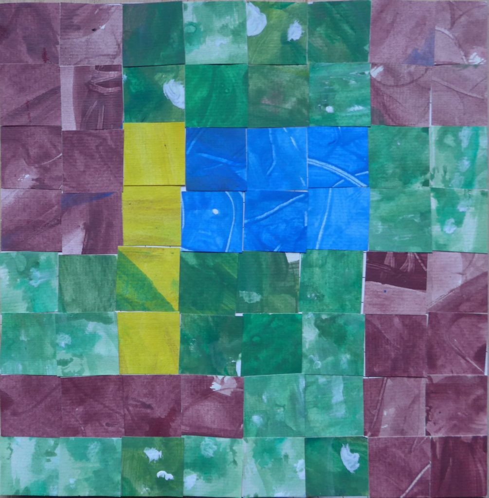 Ohne Titel Werk-Nr 2011-04, Rekonfiguration Farb-Abstraktion in Aquarell,verpixelt und rekonfiguriert (8×8 Pixel a 2,5×2,5 cm),auf Unterlage geklebtGröße (B X H) 20 cm x 20 cm Nicht mehr im Besitz der Künstlerin