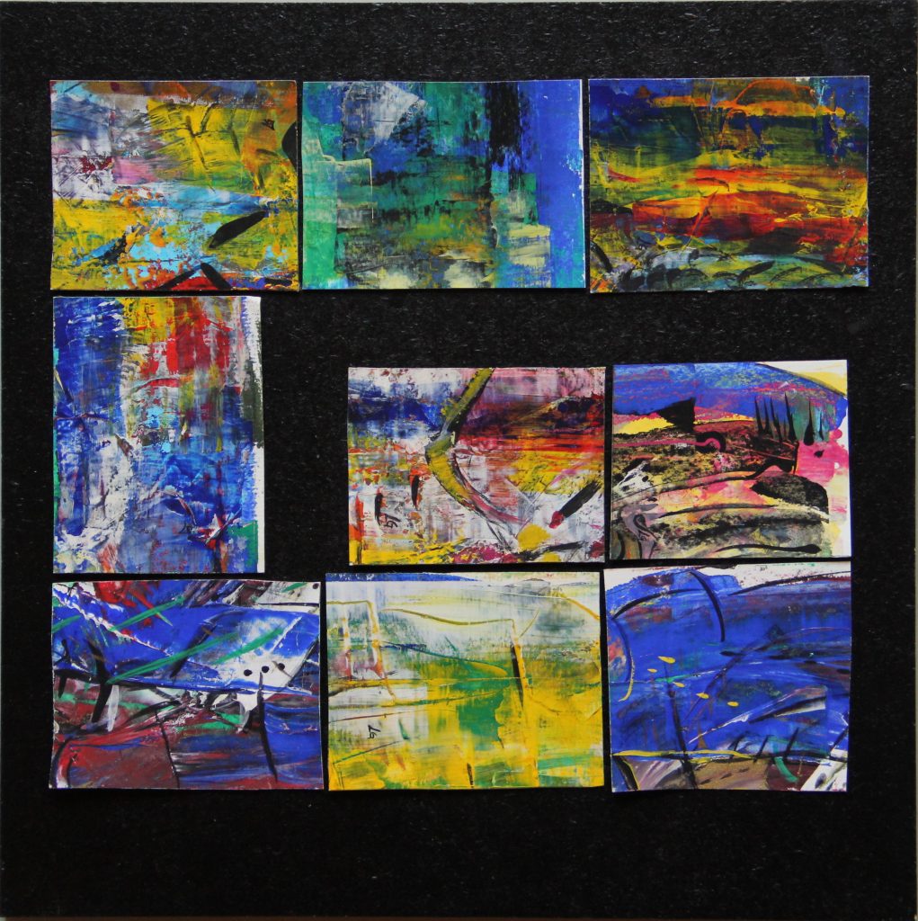 GC Werk-Nr 2013-01, Rekonfiguration Farb-Abstraktion in Acryl, zerschnitten und rekonfiguriertauf schwarze Holzplatte geklebt,Größe (B X H) 30 cm x 30 cm Nicht mehr im Besitz der Künstlerin