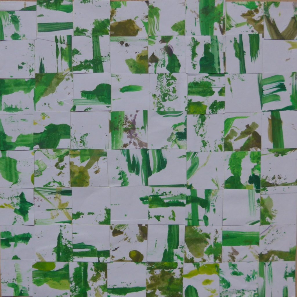 Abstraktion in Grün III Werk-Nr 2013-03, Rekonfiguration Farb-Abstraktion in grün,verpixelt und rekonfiguriert (8×8 Pixel a 2,5×2,5 cm),auf Unterlage geklebtGröße (B X H) 20 cm x 20 cm Im Besitz der Künstlerin