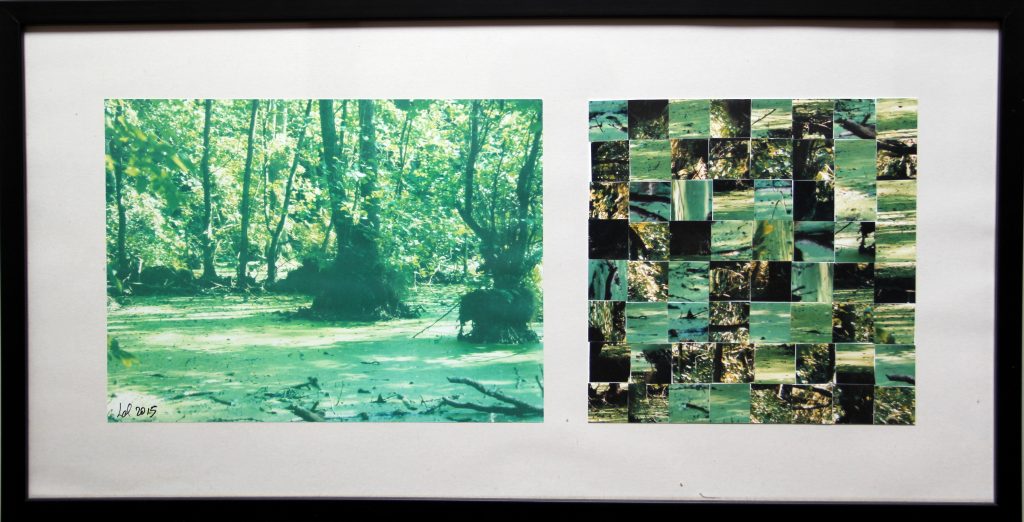 Foto vom Tümpel im Wald, Original (20×28 cm) und verpixelt rekonfiguriert (20×20 cm mit 8×8 Pixel a 2,5×2,5 cm), auf Unterlage geklebt, gerahmt, signiert, Größe (B X H) 62 cm x 32 cm