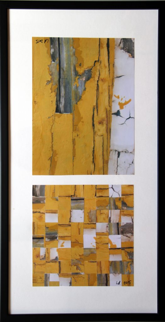 Detail-Foto vom Fisch-Kutter, Original (20×28 cm) und verpixelt rekonfiguriert (20×20 cm mit 8×8 Pixel a 2,5×2,5 cm), auf Unterlage geklebt, gerahmt, signiert, Größe (B X H) 32 cm x 62 cm