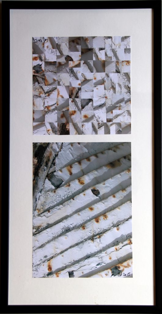 Detail-Foto vom Fisch-Kutter, Original (20×28 cm) und verpixelt rekonfiguriert (20×20 cm mit 8×8 Pixel a 2,5×2,5 cm), auf Unterlage geklebt, gerahmt, signiert, Größe (B X H) 32 cm x 62 cm