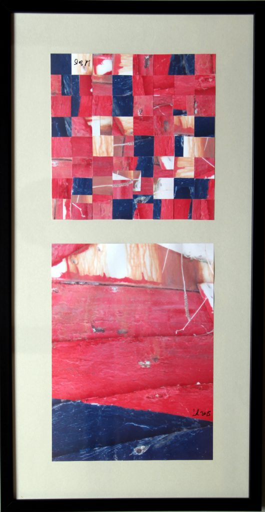 Detail-Foto vom Fisch-Kutter, Original (20×28 cm) und verpixelt rekonfiguriert (20×20 cm mit 8×8 Pixel a 2,5×2,5 cm), auf Unterlage geklebt, gerahmt, signiert, Größe (B X H) 32 cm x 62 cm