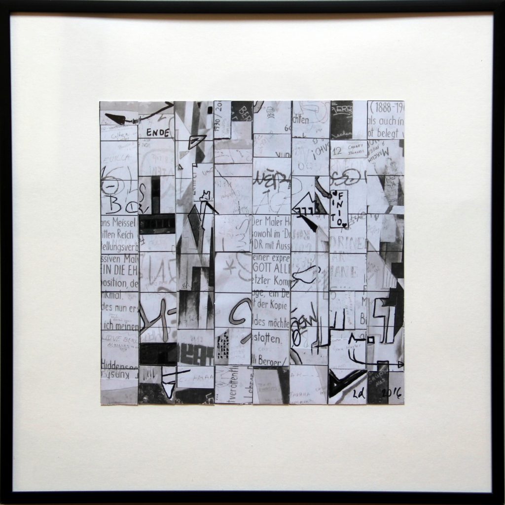 Foto von der Berliner Mauer (04/2013 in Schwarz/weiss), verpixelt, rekonfiguriert (8×8 Pixel a 2,5×2,5 cm), auf Unterlage geklebt und bemalt, gerahmt, signiert Größe (B X H) 33 cm x 33 cm