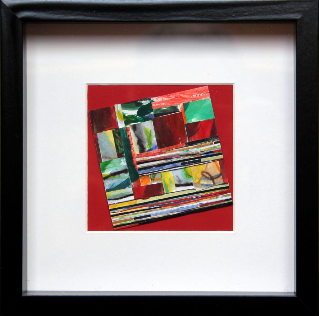 zerschnitten in Streifen und Rechtecke, rekonfiguriert (4×4 Pixel a 2,5×2,5 cm), leicht rotiert