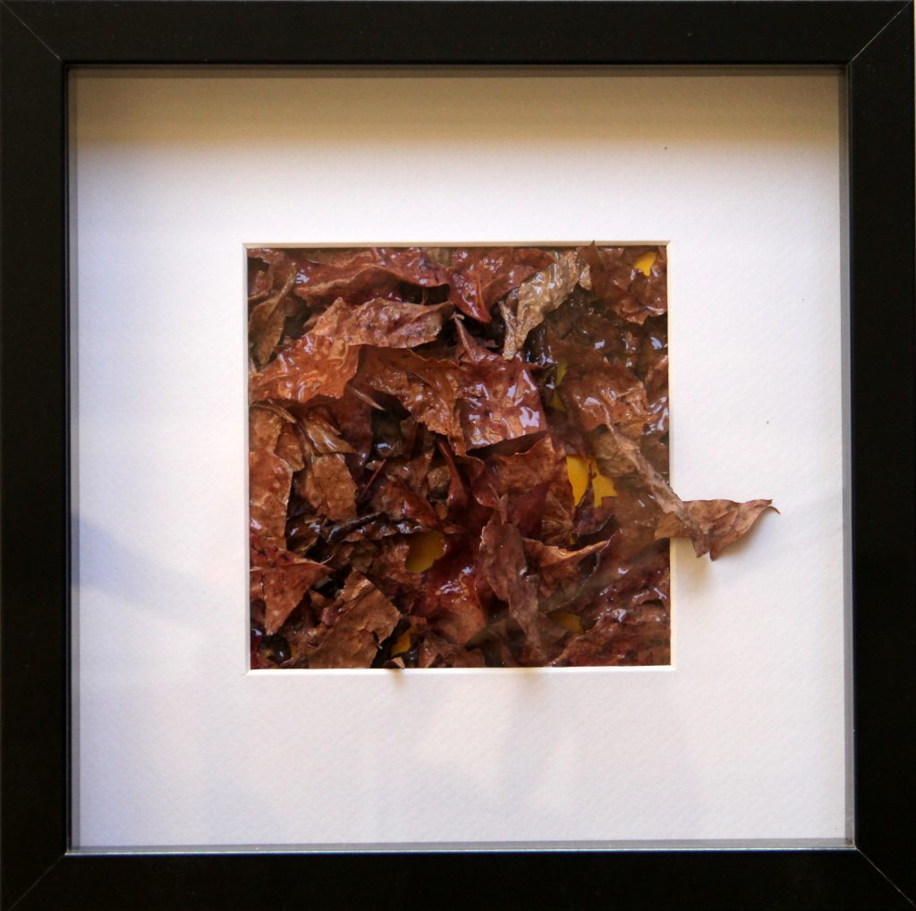 Natur-Abfall I Werk-Nr 2018-06, Assemblage Herbst-Blätter vom Amber-Baum, gesammelt und mit Spritzlack auf Unterlage geklebt, gerahmt,Größe (B X H) 25 cm x 25 cm Nicht mehr im Besitz der Künstlerin