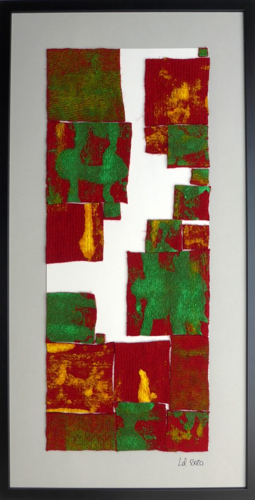 Wolle, bemalt mit Acryl, zerschnitten und rekonfiguriert (zu 2×10 Quadraten mit je 1-10 cm Kantenlänge), auf 20×50 cm Unterlage geklebt, gerahmt, signiert, Größe (B X H) 32 cm x 62 cm