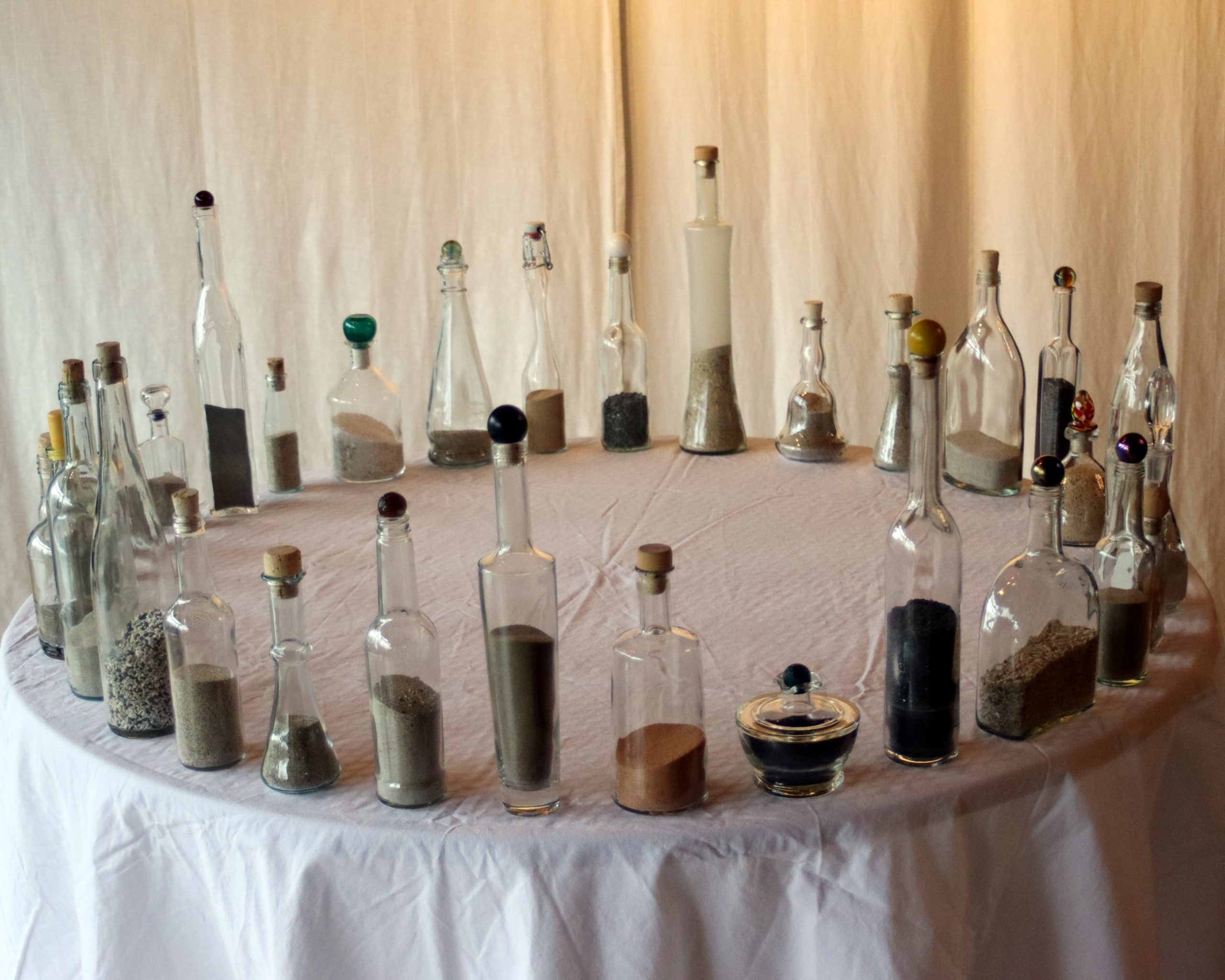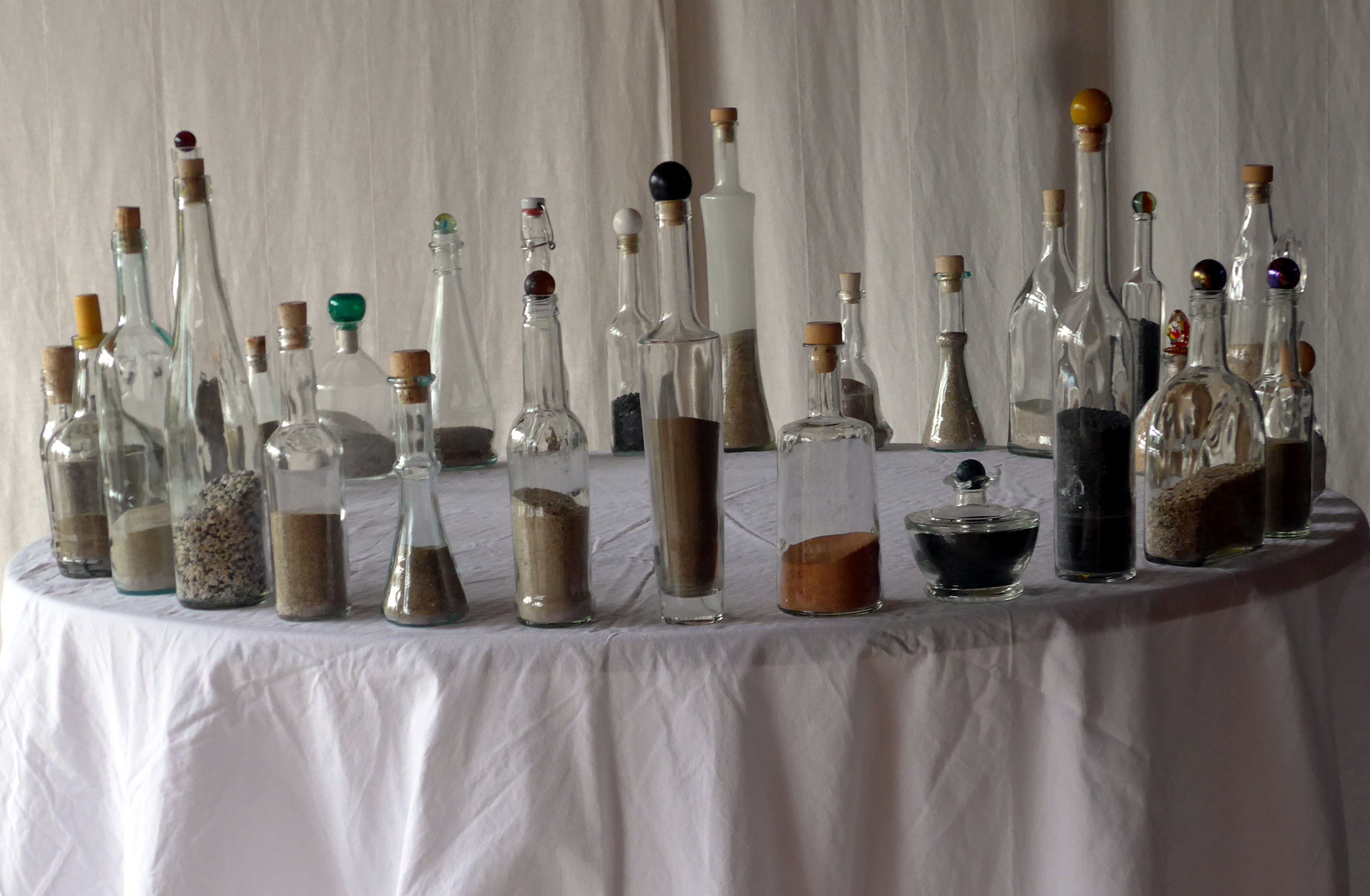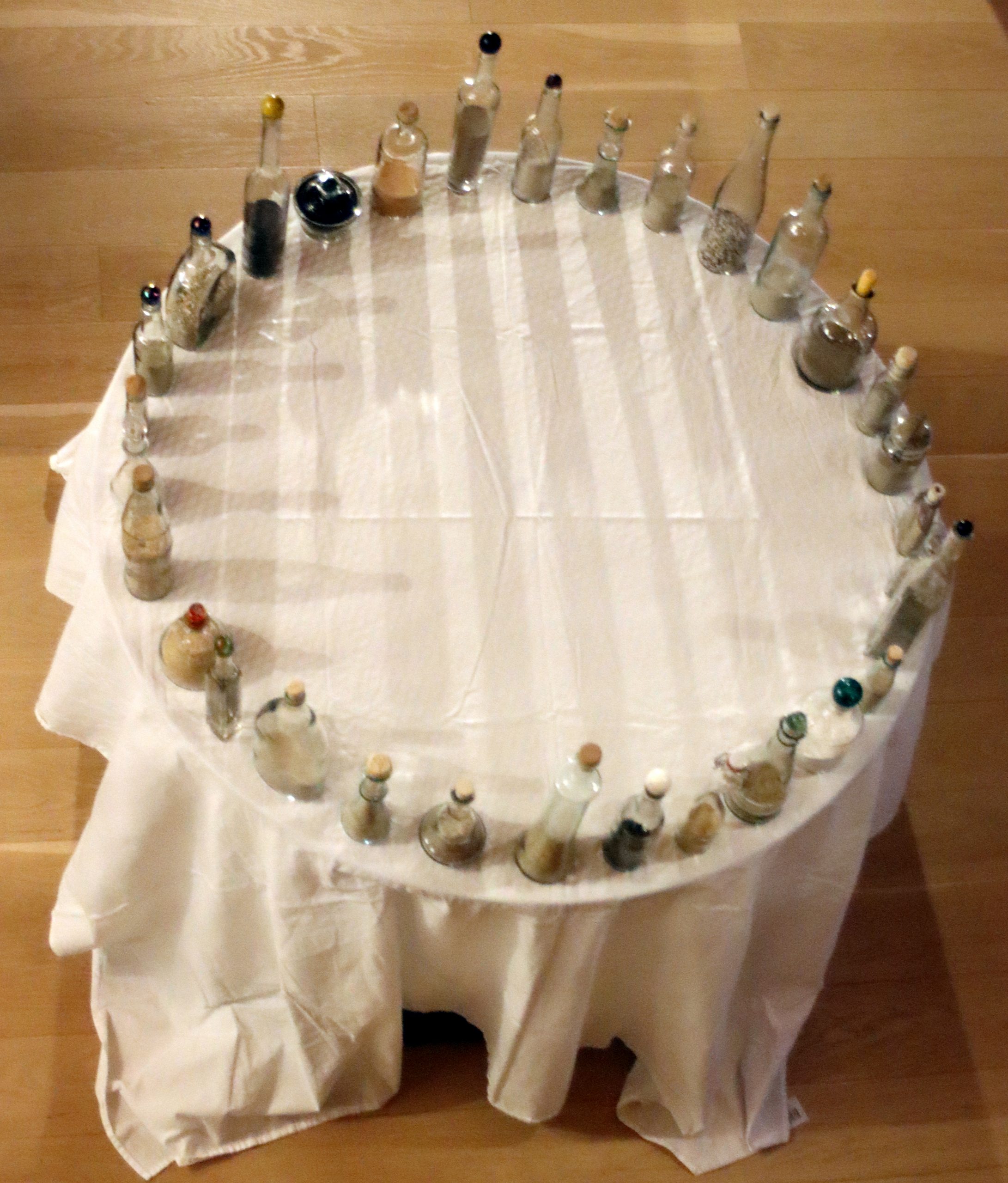 gesammelt und abgefüllt in Flaschen, aufgestellt und im Kreis angeordnet