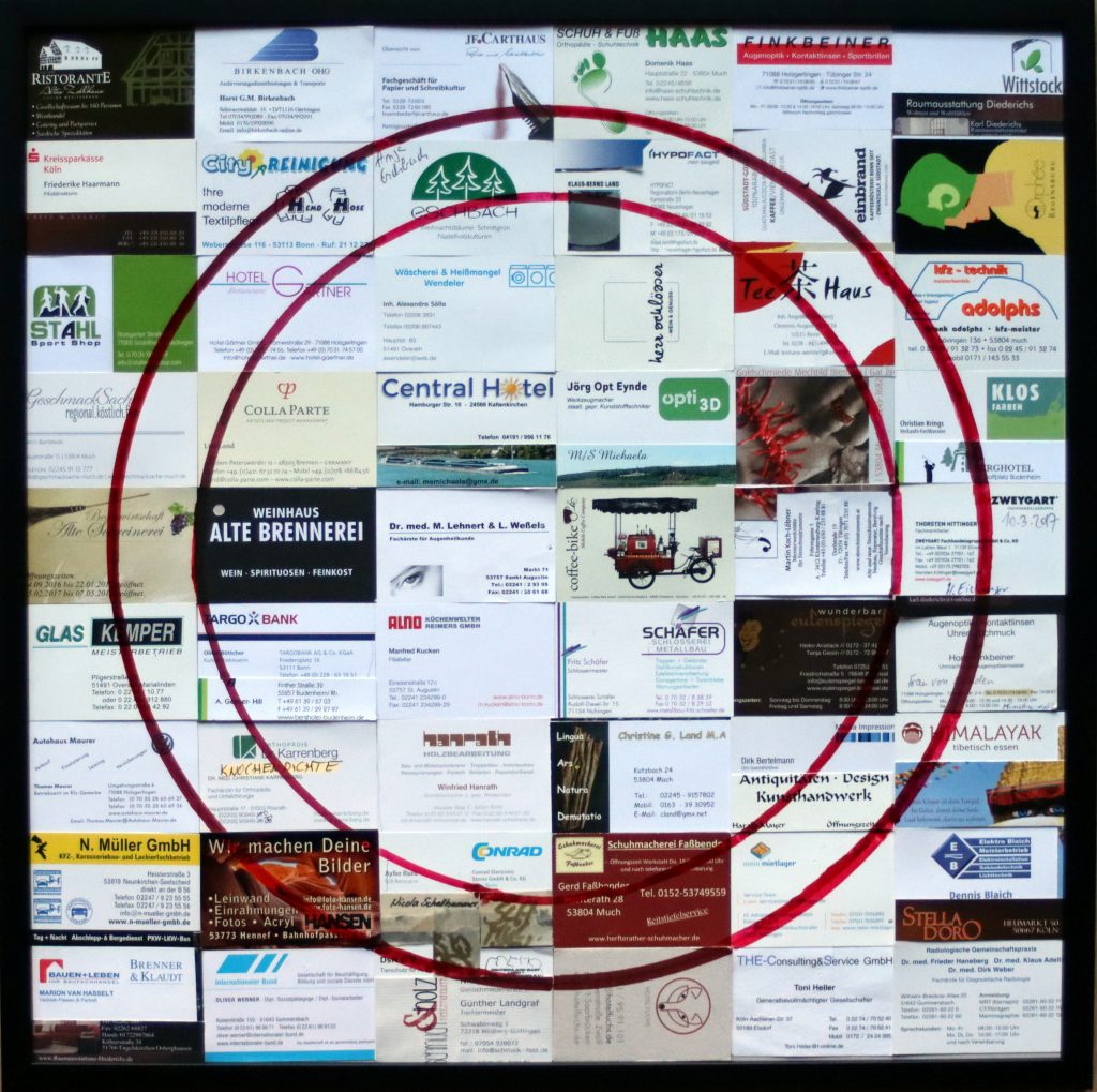 Business-Kreise I Werk-Nr 2023-01, Collage Collage aus Business-Cards Deutschland,auf Unterlage geklebt, gerahmt, (auf der Rückseite) signiertGröße (B X H) 52,5 cm x 52,5 cm Im Besitz der Künstlerin (unverkäuflich)